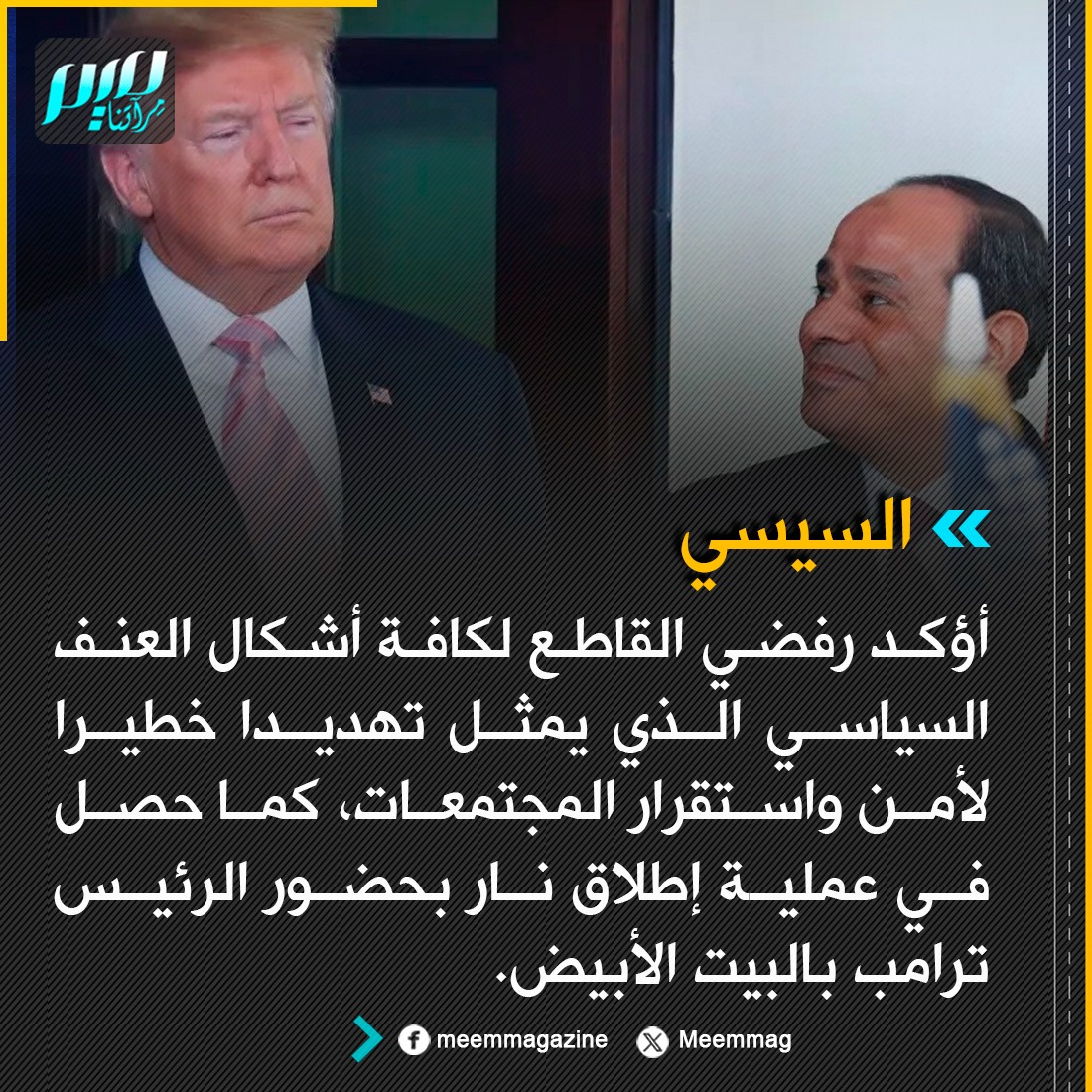السيسي: أؤكد رفضي القاطع لكافة أشكال العنف السياسي الذي يمثل تهديدا خطيرا لأمن واستقرار المجتمعات، كما حصل في عملية إطلاق نار بحضور الرئيس ترامب بالبيت الأبيض.