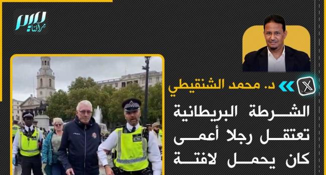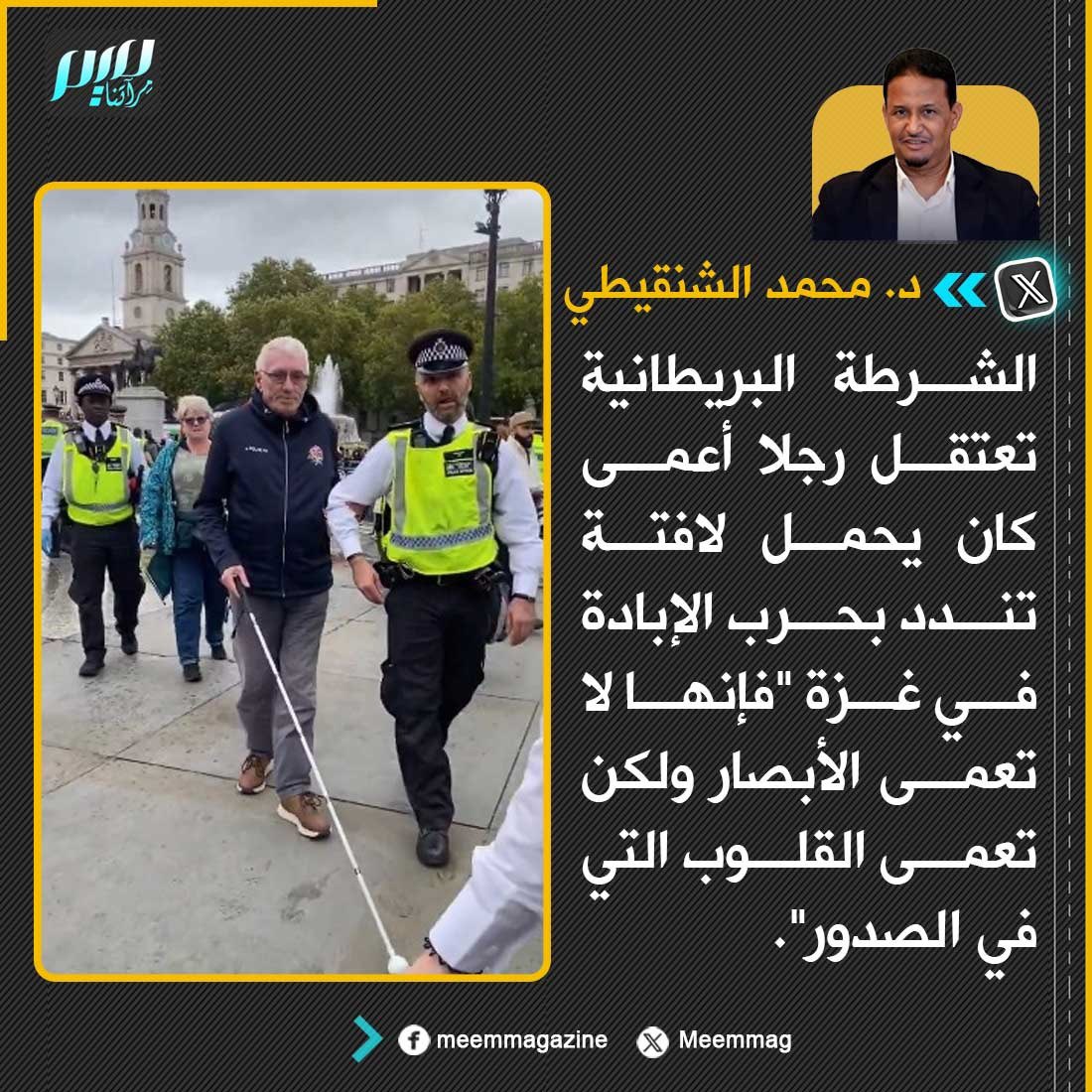 الشنقيطي: الشرطة البريطانية تعتقل رجلا أعمى كان يحمل لافتة تندد بحرب الإبادة في غزة "فإنها لا تعمى الأبصار ولكن تعمى القلوب التي في الصدور".
