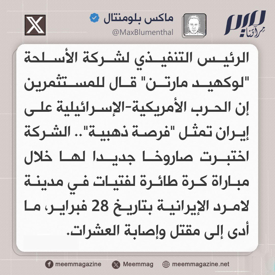 الصحفي الأمريكي ماكس بلومنتال: "لوكهيد مارتن" تعتبر الحرب الأمريكية-الإسرائيلية على إيران "فرصة ذهبية" لاختبار صواريخها.