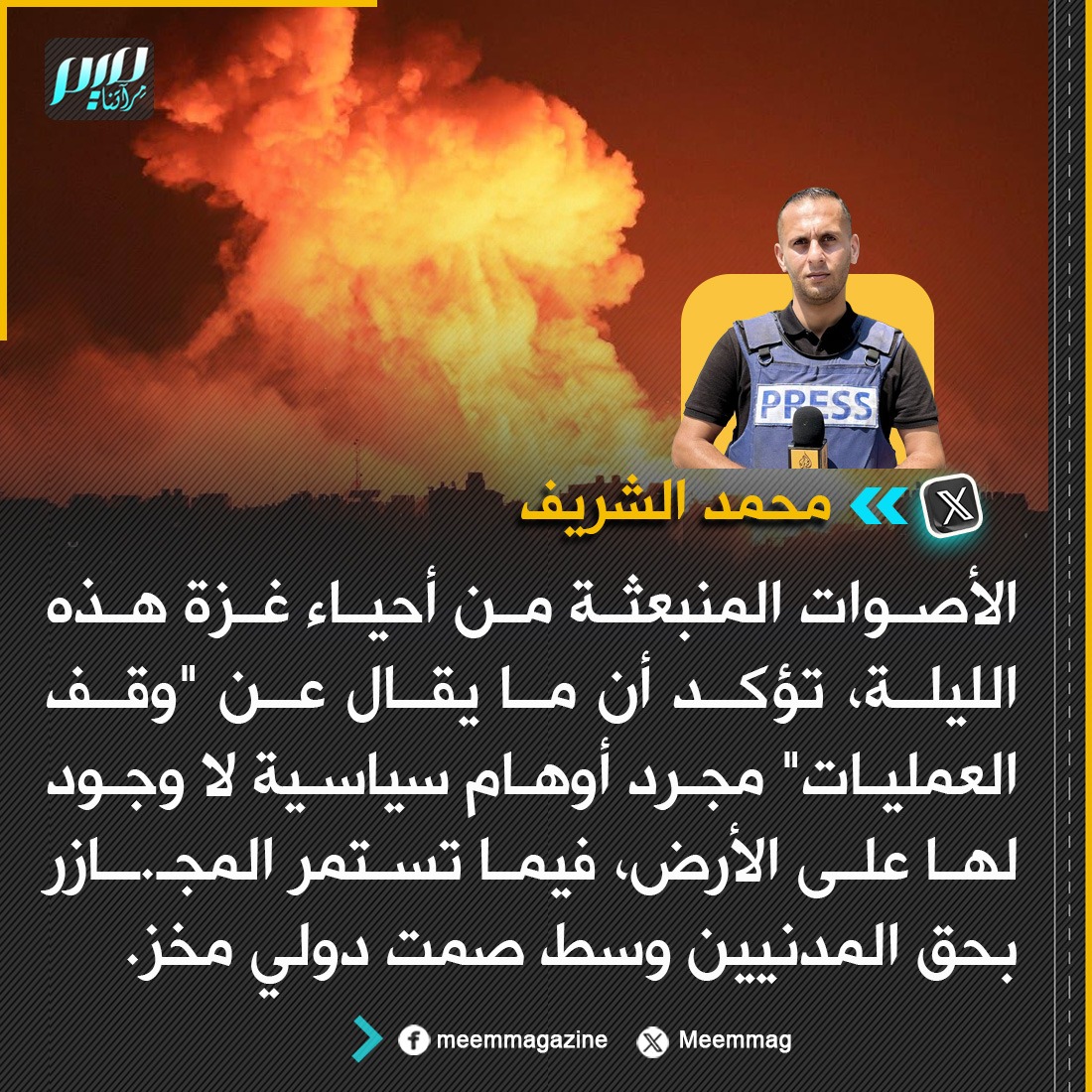 الصحفي محمد الشريف: الأصوات المنبعثة من أحياء غزة هذه الليلة، تؤكد أن ما يقال عن "وقف العمليات" مجرد أوهام سياسية لا وجود لها على الأرض.