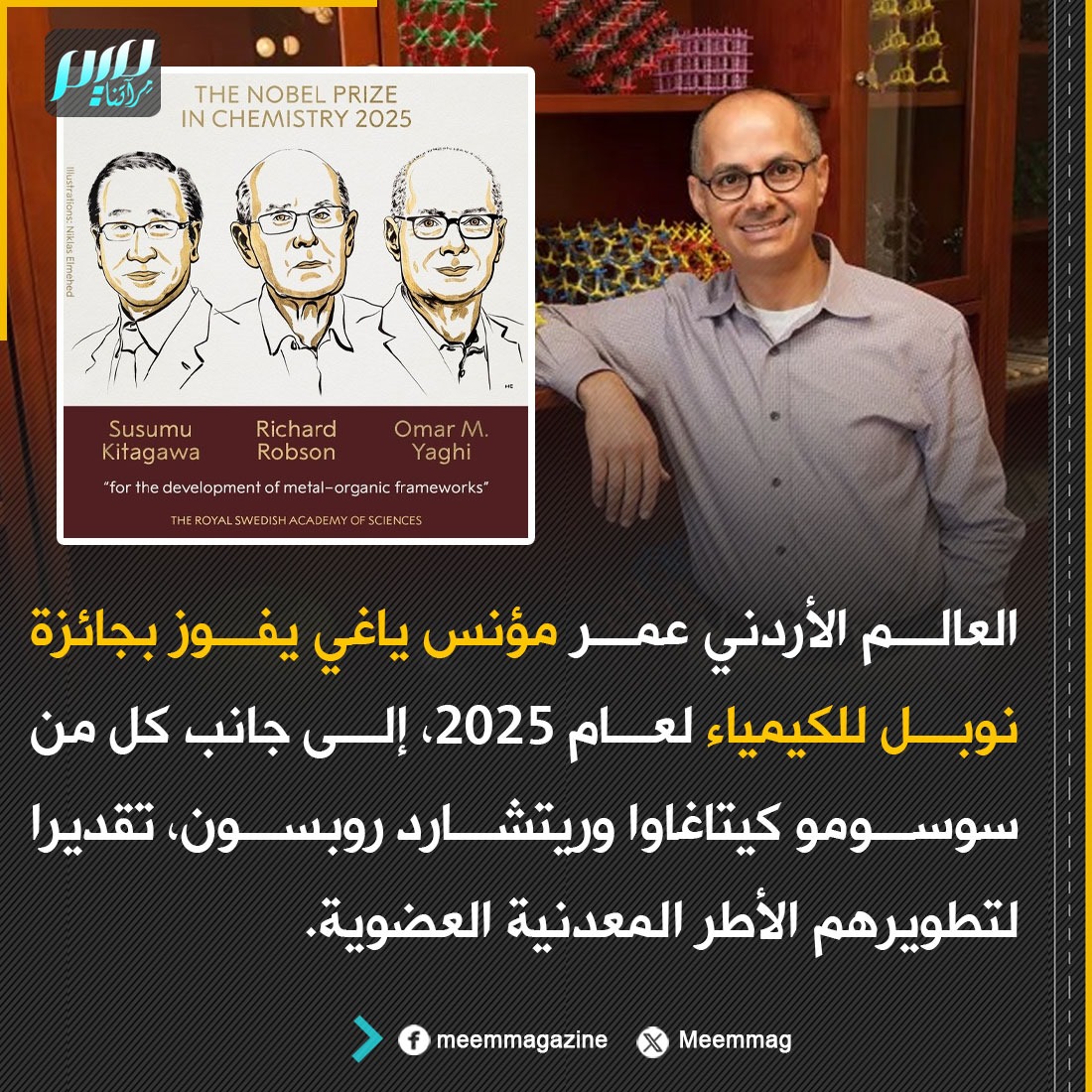 العالم الأردني عمر مؤنس ياغي يفوز بجائزة نوبل للكيمياء لعام 2025، إلى جانب كل من سوسومو كيتاغاوا وريتشارد روبسون، تقديرا لتطويرهم الأطر المعدنية العضوية.