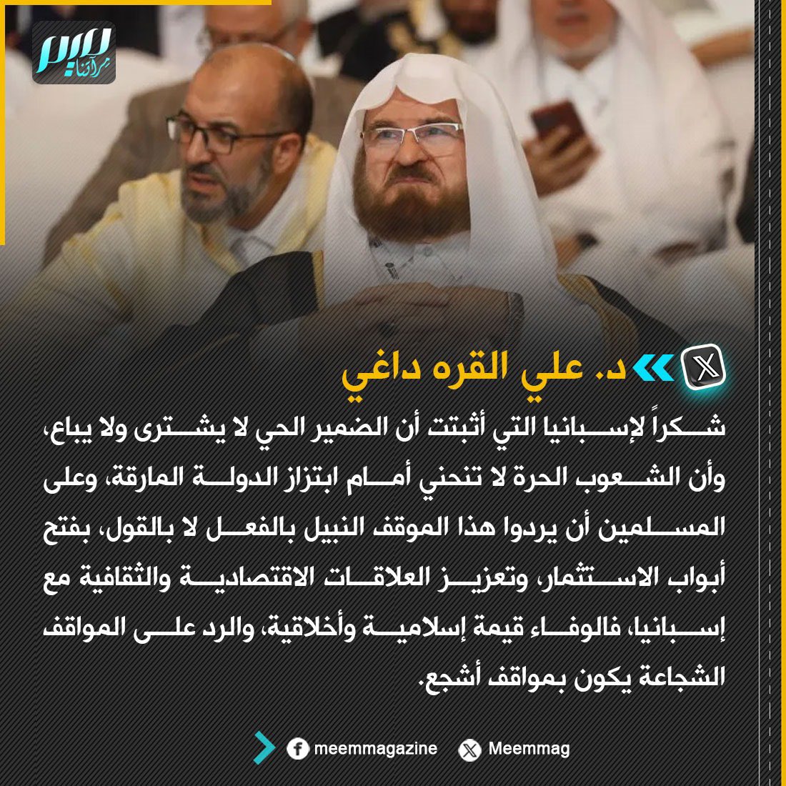 القره داغي: على المسلمين أن يردوا على موقف الإسبان النبيل بالفعل لا بالقول، بفتح أبواب الاستثمار، وتعزيز العلاقات الاقتصادية والثقافية مع إسبانيا، فالوفاء قيمة إسلامية وأخلاقية، والرد على المواقف الشجاعة يكون بمواقف أشجع.