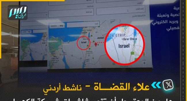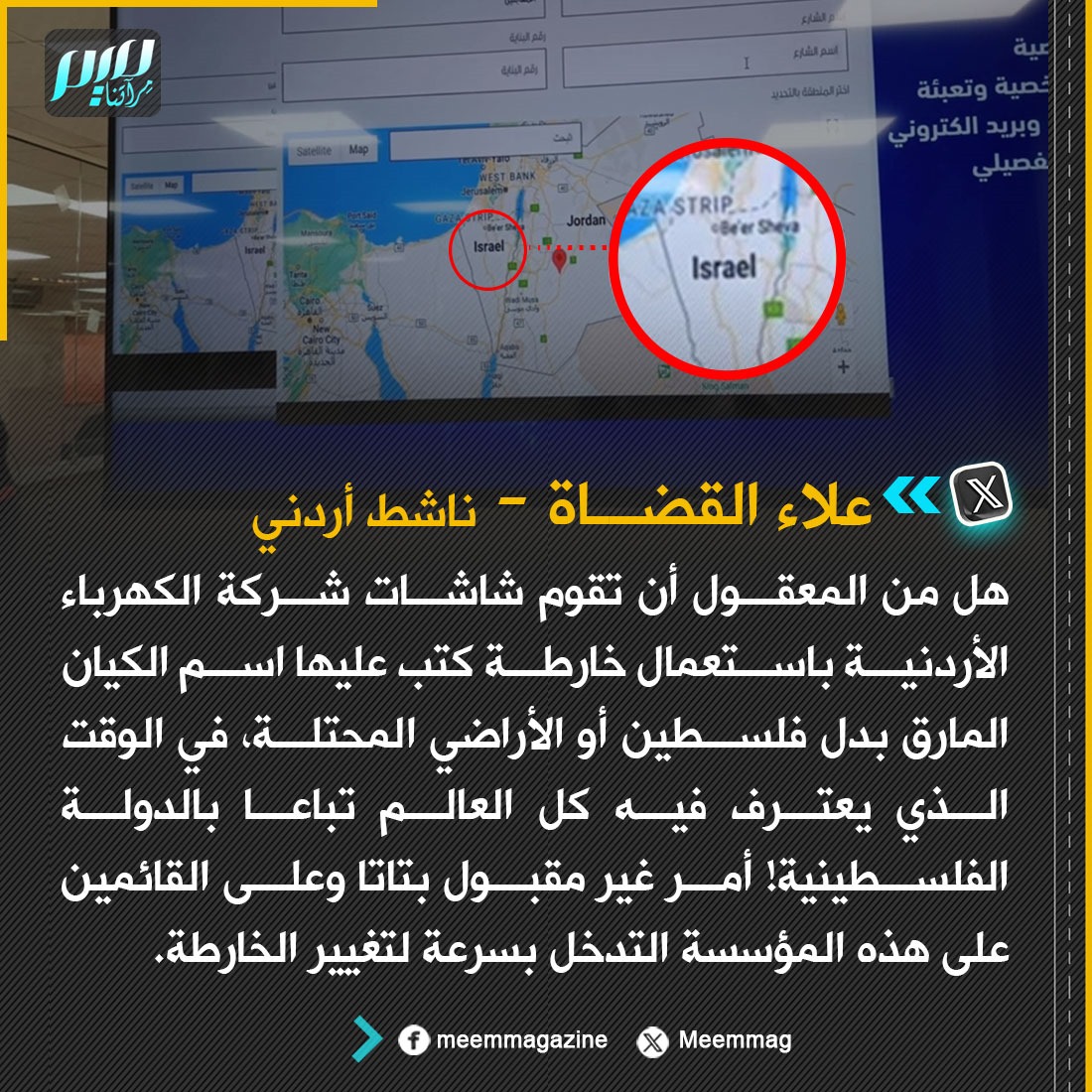 الناشط الأردني علاء القضاة: هل من المعقول أن تقوم شاشات شركة الكهرباء الأردنية باستعمال خارطة كتب عليها اسم الكيان المـ ـارق بدل فلسطين أو الأراضي المحتلة، في الوقت الذي يعترف فيه كل العالم تباعا بالدولة الفلسطينية!