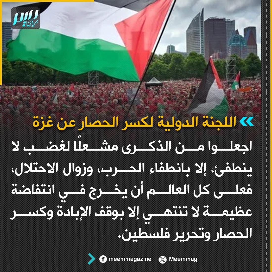 اللجنة الدولية لكسر الحصار عن غزة: اجعلوا من الذكرى مشعلًا لغضب لا ينطفئ، إلا بانطفاء الحرب، وزوال الاحتلال، فعلى كل العالم أن يخرج في انتفاضة عظيمة لا تنتهي إلا بوقف الإبادة وكسر الحصار وتحرير فلسطين.