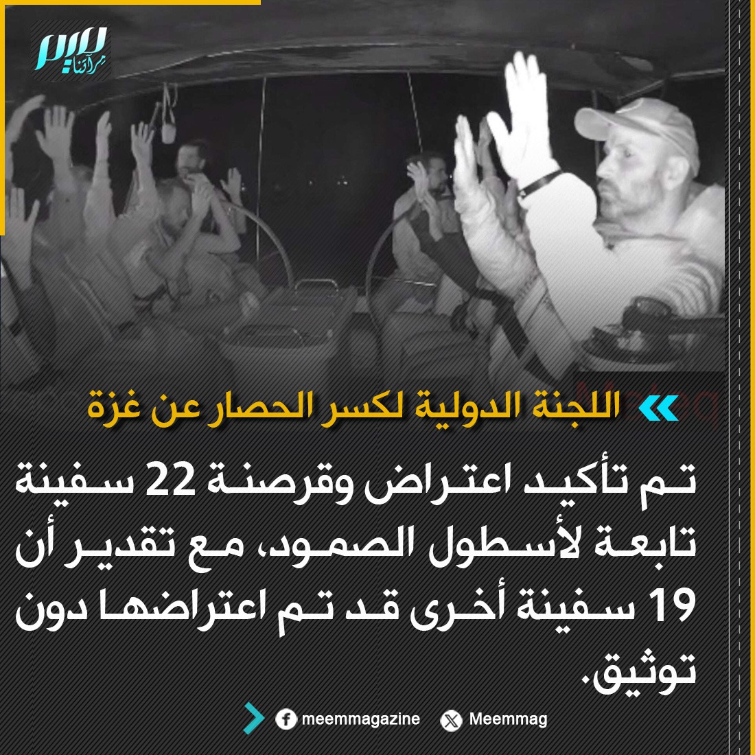 اللجنة الدولية لكسر الحصار عن غزة: تم تأكيد اعتراض وقرصنة 22 سفينة تابعة لأسطول الصمود، مع تقدير أن 19 سفينة أخرى قد تم اعتراضها دون توثيق.