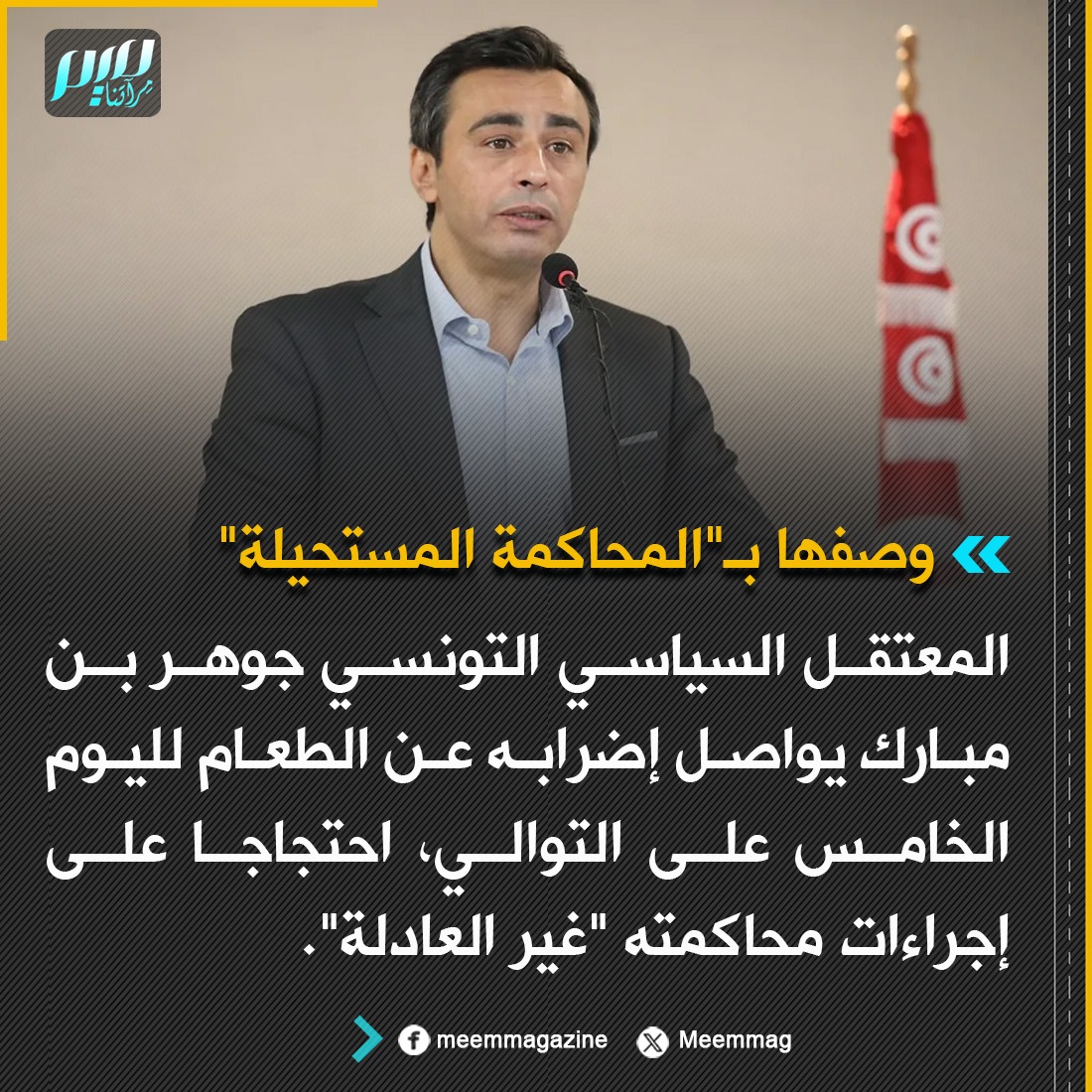 المعتقل السياسي التونسي جوهر بن مبارك يواصل إضرابه عن الطعام لليوم الخامس على التوالي، احتجاجا على إجراءات محاكمته "غير العادلة".