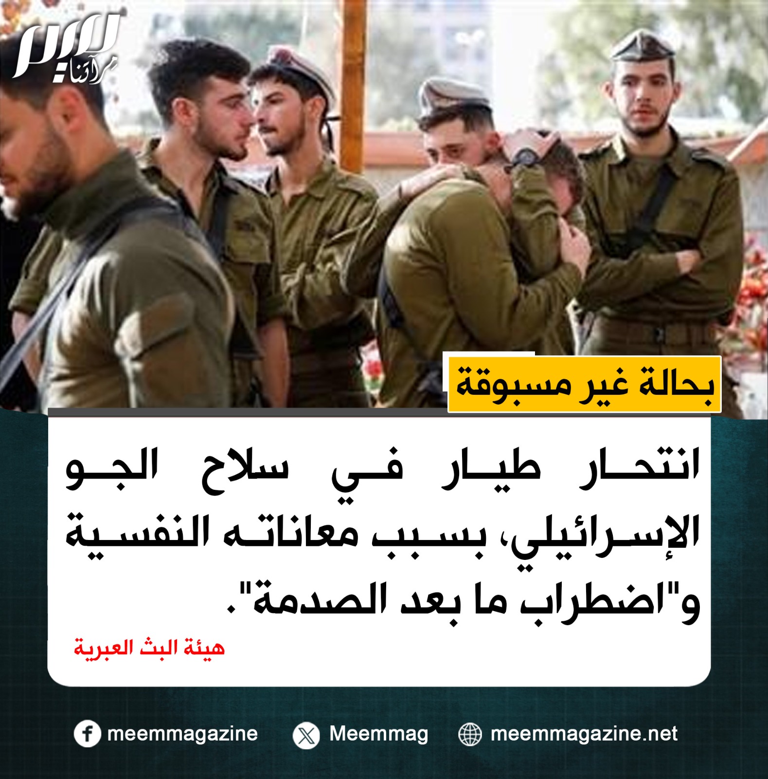 انتحار طيار في سلاح الجو الإسرائيلي، بسبب معاناته النفسية و"اضطراب ما بعد الصدمة"، بحسب تقرير لهيئة البث العبرية.