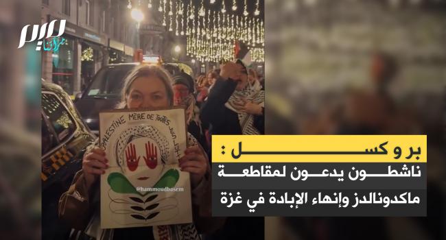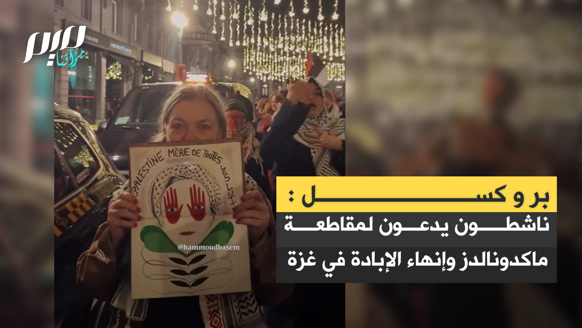 "‘قاطعوا ماكدونالدز"… ناشطون داعمون للشعب الفلسطيني يتظاهرون أمام أحد فروع سلسلة مطاعم ماكدونالدز في بروكسل، مجددين دعوتهم لمقاطعتها بسبب تورطها في دعم الجيش الإسرائيلي وتقديم وجبات له.