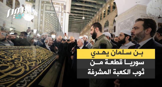 الشرع يضع قطعة من ثوب الكعبة المشرفة في رحاب الجامع الأموي بدمشق، وهي هدية مقدمة من ولي العهد السعودي الأمير محمد بن سلمان بمناسبة الذكرى الأولى لسقوط نظام الأسد.