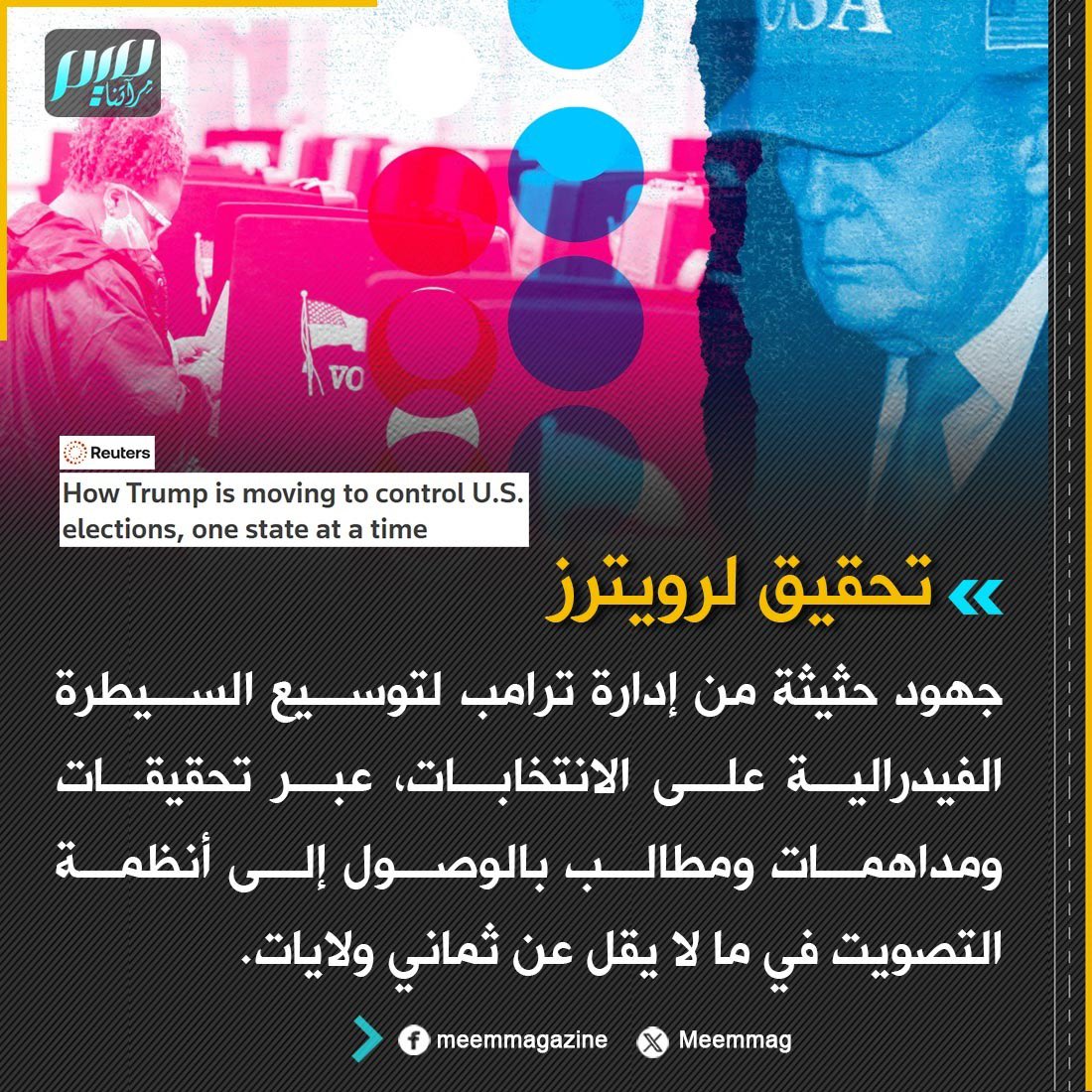 تحقيق لرويترز: جهود حثيثة من إدارة ترامب لتوسيع السيطرة الفيدرالية على الانتخابات، عبر تحقيقات ومداهمات ومطالب بالوصول إلى أنظمة التصويت في ما لا يقل عن ثماني ولايات.