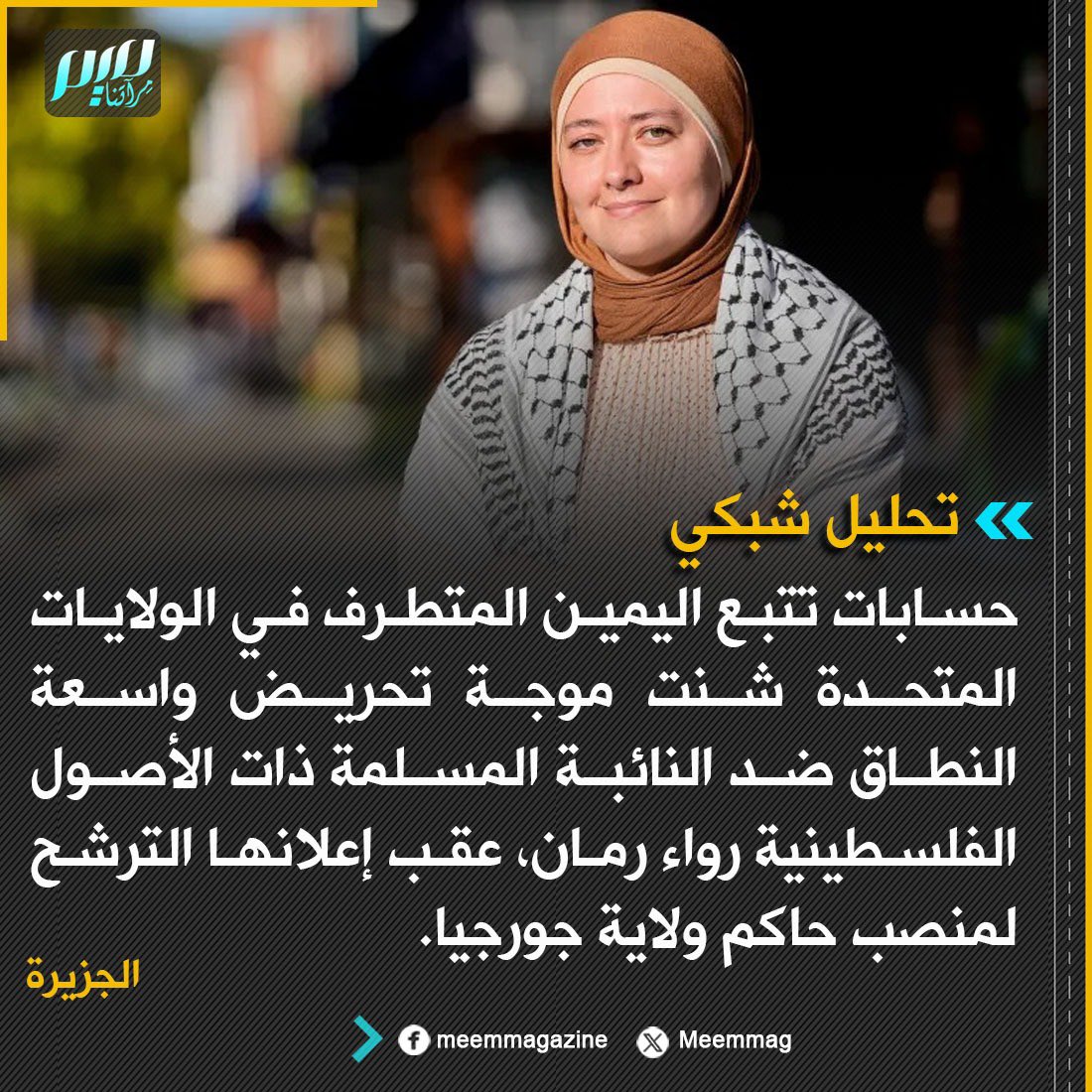 تحليل شبكي: حسابات تتبع اليمين المتطرف في الولايات المتحدة شنت موجة تحريض واسعة النطاق ضد النائبة المسلمة ذات الأصول الفلسطينية رواء رمان، عقب إعلانها الترشح لمنصب حاكم ولاية جورجيا.