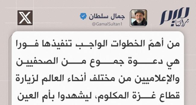 جمال سلطان: من أهمّ الخطوات الواجب تنفيذها فورا هي دعوة جموع من الصحفيين والإعلاميين من مختلف أنحاء العالم لزيارة قطاع غزة المكلوم