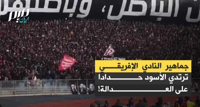 جماهير النادي الإفريقي في تونس ترتدي اللون الأسود حدادًا على تبرئة القضاء التونسي لـ 12 شرطيا متهمين بقتل المشجع عمر العبيدي عام 2018 .
