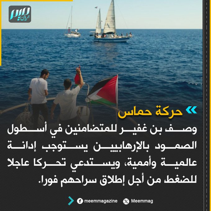 حركة حماس: وصف بن غفير للمتضامنين في أسطول الصمود بالإرهابيين يستوجب إدانة عالمية وأممية.