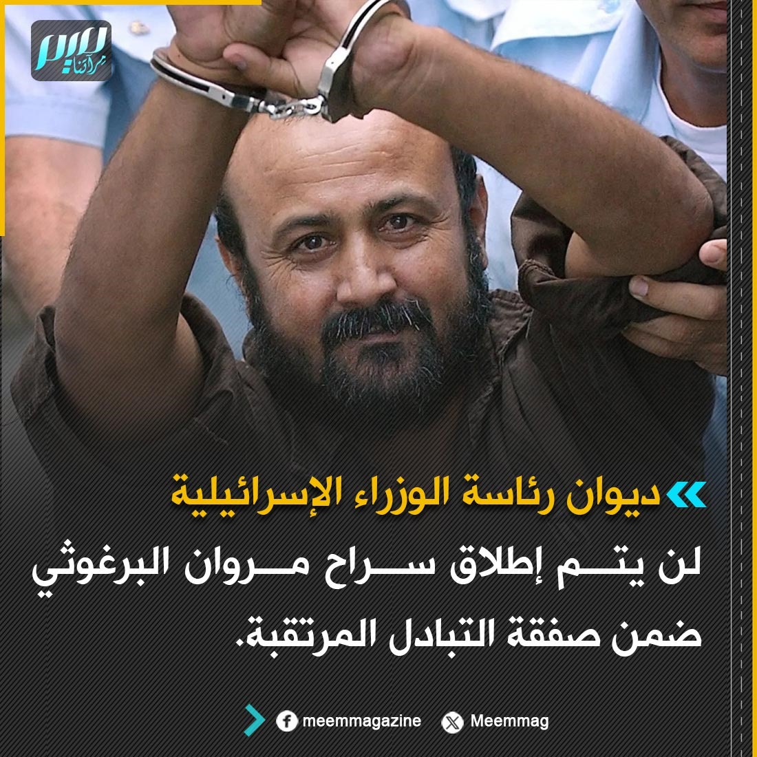 ديوان رئاسة الوزراء الإسرائيلية: لن يتم إطلاق سراح مروان البرغوثي ضمن صفقة التبادل المرتقبة