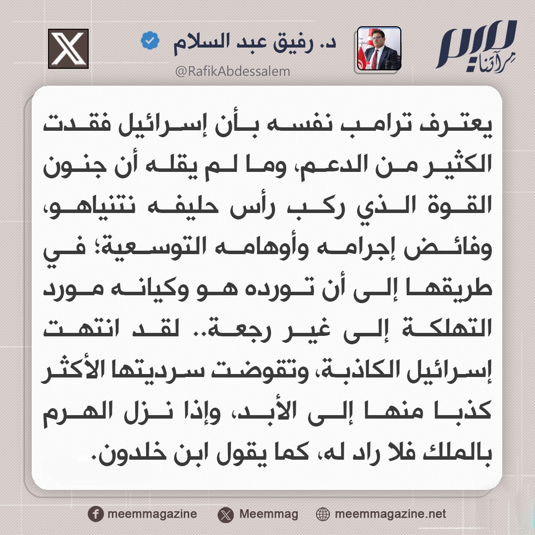 الوزير التونسي السابق د. رفيق عبد السلام: لقد انتهت إسرائيل الكاذبة، وتقوضت سرديتها الأكثر كذبا منها إلى الأبد.