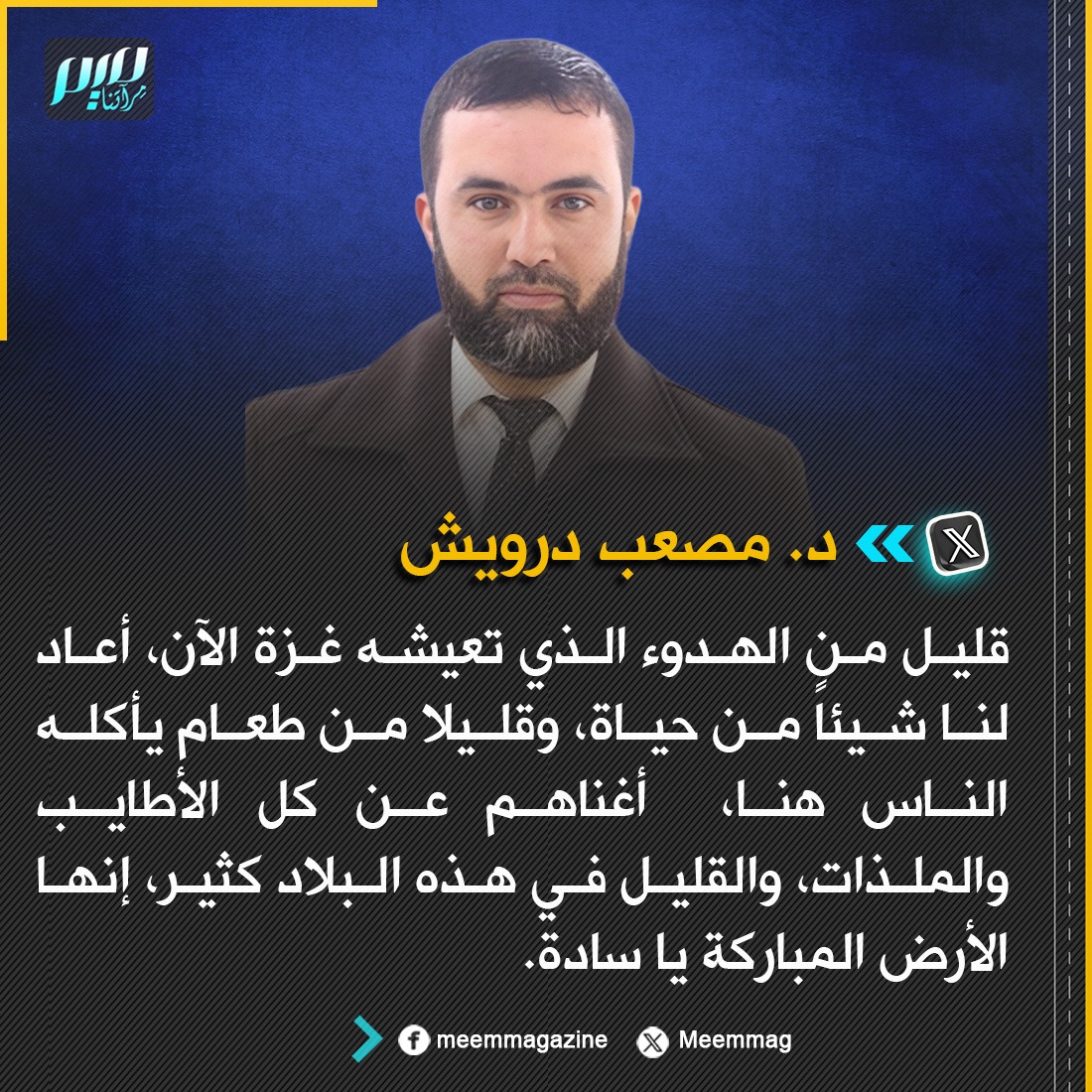 د. مصعب درويش: قليل من الهدوء الذي تعيشه غزة الآن، أعاد لنا شيئاً من حياة، وقليلا من طعام يأكله الناس هنا، أغناهم عن كل الأطايب والملذات، والقليل في هذه البلاد كثير، إنها الأرض المباركة يا سادة.