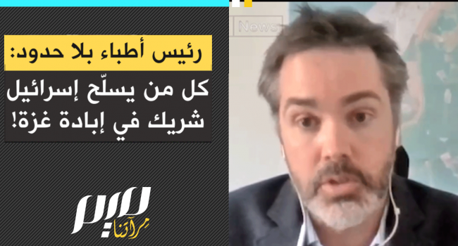 الدكتور كريس لوكيير، الأمين العام لمنظمة أطباء بلا حدود: "كلّ من يزود إسرائيل بالأسلحة المستخدمة في القتل العشوائي للمدنيين متواطئ في الصراع في غزة، بما في ذلك الولايات المتحدة وبريطانيا"