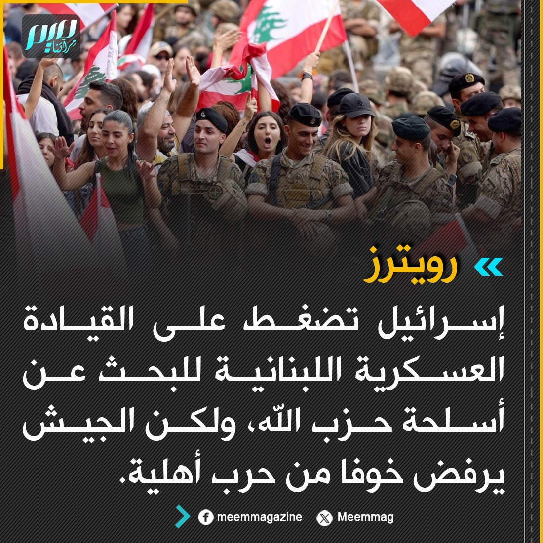 رويترز: إسرائيل تضغط على القيادة العسكرية اللبنانية للبحث عن أسلحة حزب الله، ولكن الجيش يرفض خوفا من حرب أهلية.