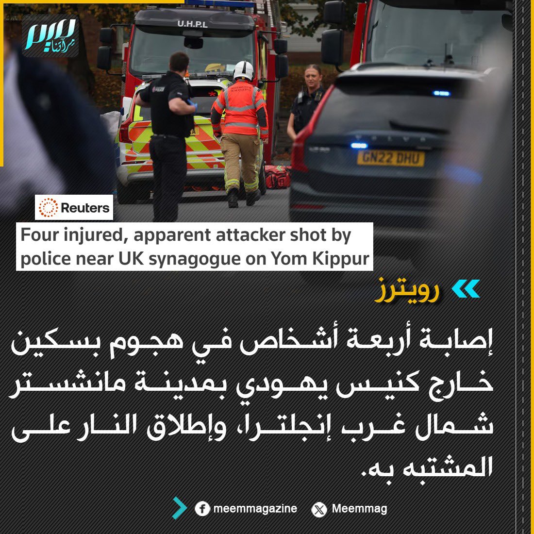 رويترز: إصابة أربعة أشخاص في هجوم بسكين خارج كنيس يهودي بمدينة مانشستر شمال غرب إنجلترا، وإطلاق النار على المشتبه به.