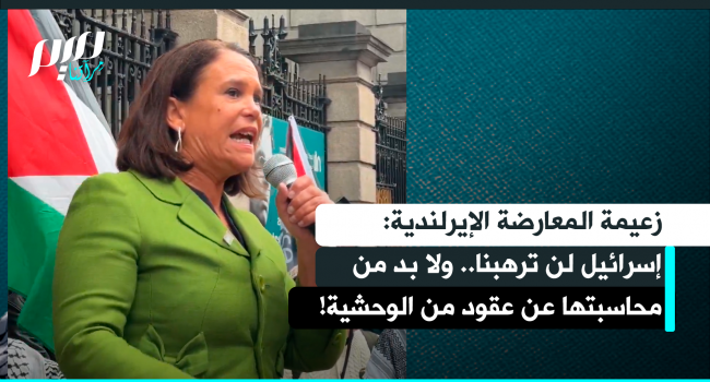 "إسرائيل لن ترهبنا.. ولا بد من محاسبتها عن عقود من الوحشية!".. زعيمة المعارضة الأيرلندية "ماري لو ماكدونالد" تندد، في خطاب قوي لها، بما تقترفه من جرائم متواصلة، ليس فقط منذ 7 أكتوبر، بل منذ 1948، معقبة: "المذبحة تُبث على هواتف الجميع اليوم والعالم يشاهد!".