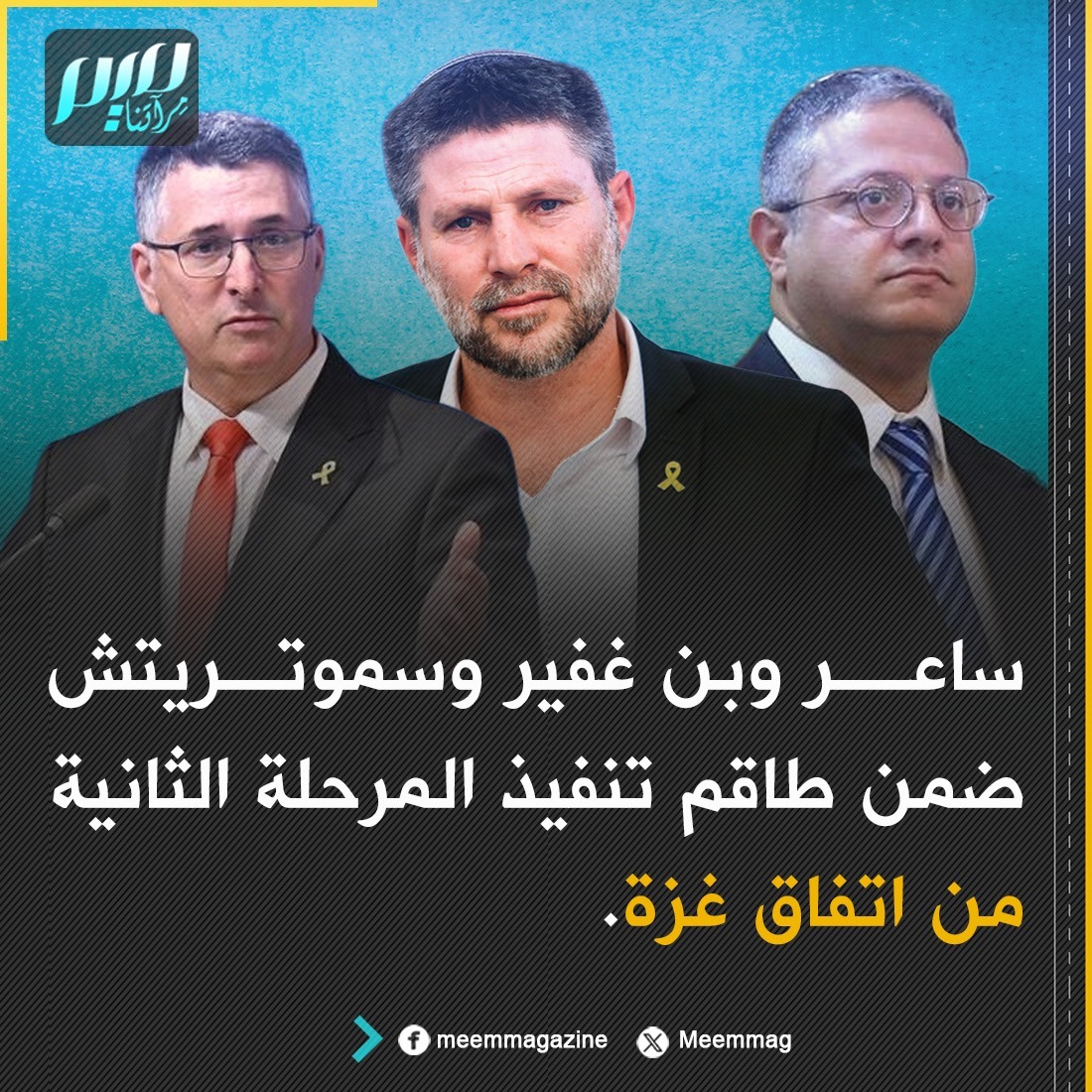 ساعر وبن غفير وسموتريتش ينضمون إلى الطاقم المسؤول عن تنفيذ المرحلة الثانية من اتفاق وقف النار في غزة، وفق هيئة البث الإسرائيلية.