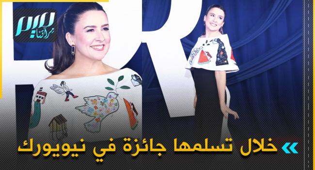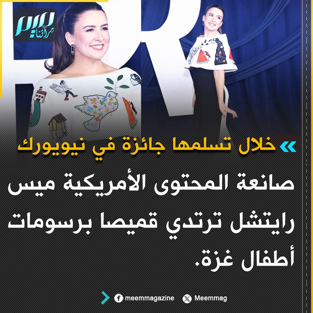 خلال تسلمها جائزة نساء العام 2025 من مجلة غلامور في نيويورك، صانعة المحتوى الأمريكية ميس رايتشل ترتدي قميصا برسومات أطفال غزة.