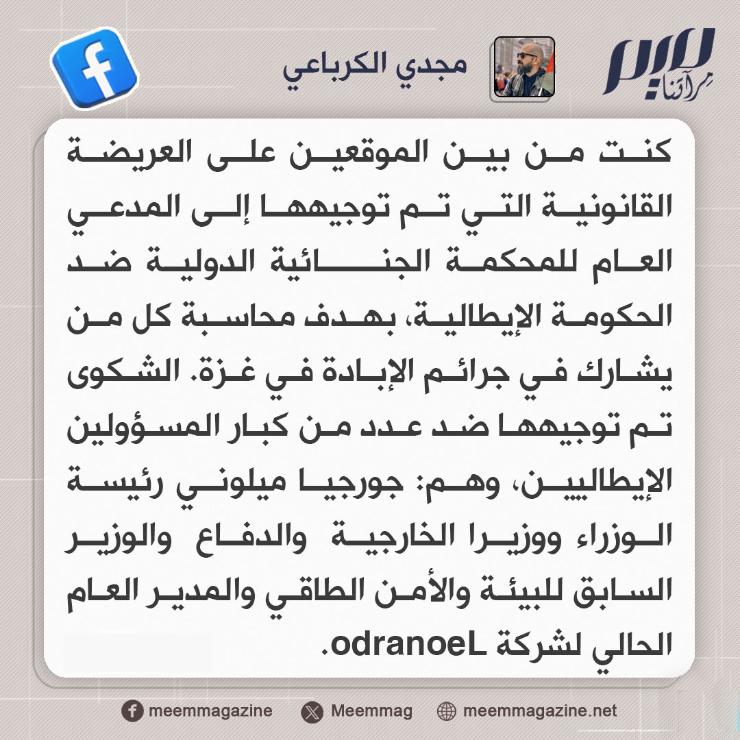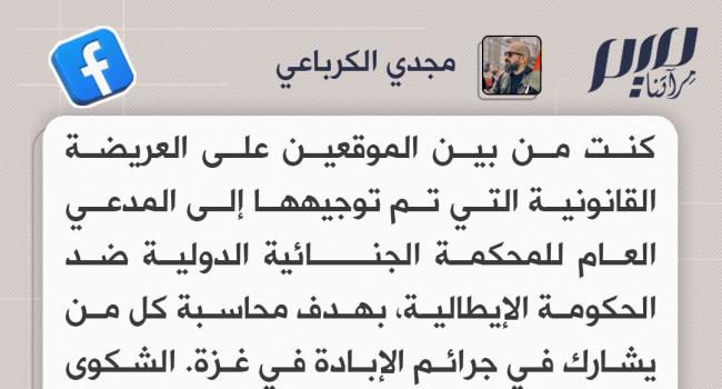 الناشط التونسي مجدي الكرباعي: كنت من بين الموقعين على العريضة القانونية التي تم توجيهها إلى المدعي العام للمحكمة الجنائية الدولية ضد الحكومة الإيطالية، بهدف محاسبة كل من يشارك في جرائم الإبادة في غزة.
