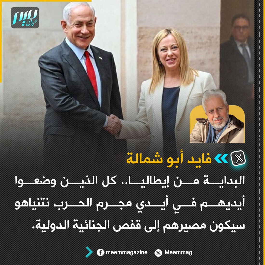 فايد أبو شمالة : البداية من إيطاليا.. كل الذين وضعوا أيديهم في أيدي مجرم الحرب نتنياهو سيكون مصيرهم إلى قفص الجنائية الدولية.