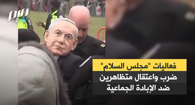 تعرض متظاهرين ضد الإبادة الجماعية، ارتدوا أقنعة تجسد رئيس وزراء الاحتلال بنيامين نتنياهو والرئيس الأمريكي دونالد ترامب للاعتداء بالضرب والاعتقال من قبل الشرطة، وذلك على هامش فعاليات "مجلس السلام" في واشنطن.