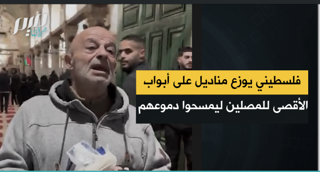 بمشهد مؤثر.. فلسطيني يقوم بتوزيع المناديل على أبواب المسجد الأقصى المبارك للمصلين ليمسحوا دموعهم بعد غياب 40 يوماً عنه، بسبب إغلاقه من قبل قوات الاحتلال.