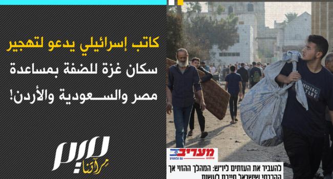 كاتب إسرائيلي يدعو لتهجير سكان قطاع غزة إلى الضفة الغربية، وتجنيد مصر و السعودية و الأردن وغيرها من الدول العربية لهذه المهمة، وبذلك يكون الخلاص من حركة حماس وقوتها العسكرية وحاضنتها الشعبية، فما هي تفاصيل مشروعه؟