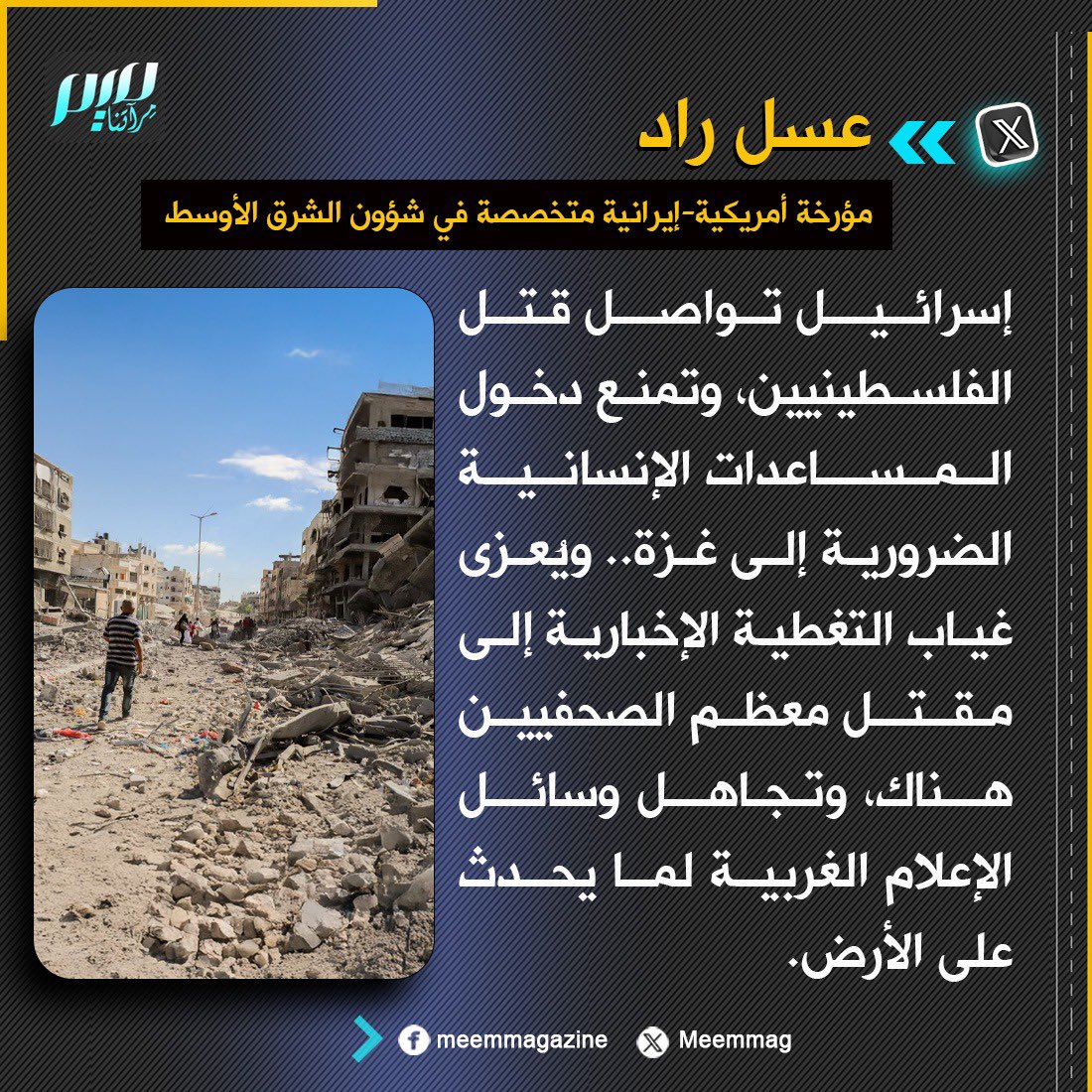 مؤرخة أمريكية-إيرانية: يُعزى غياب التغطية الإخبارية للانتهاكات التي تقترفها إسرائيل في غزة، إلى مقتل معظم الصحفيين هناك.