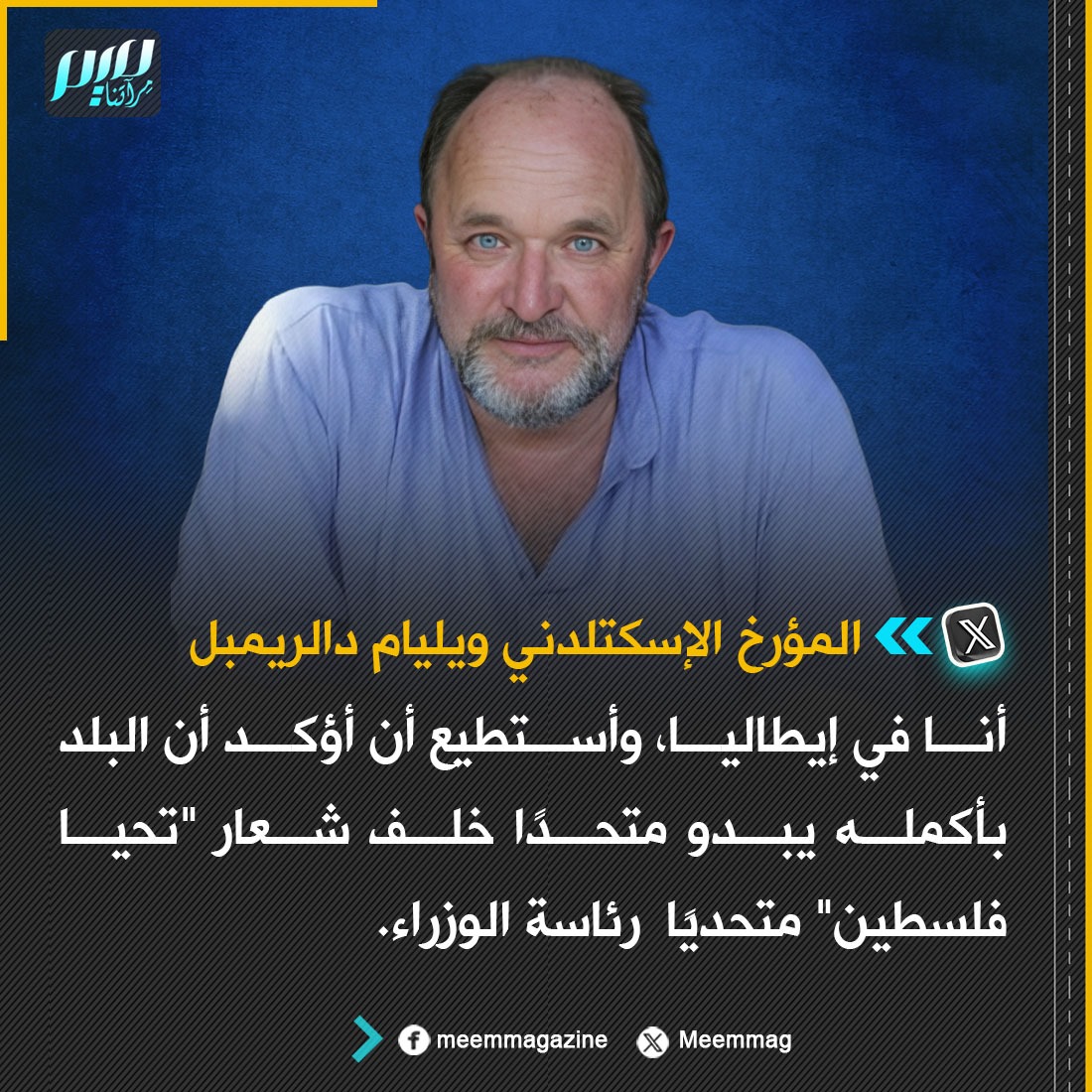 مؤرخ إسكتلدني: أنا في إيطاليا، وأستطيع أن أؤكد أن البلد بأكمله يبدو متحدًا خلف شعار "تحيا فلسطين" متحديًا رئاسة الوزراء.