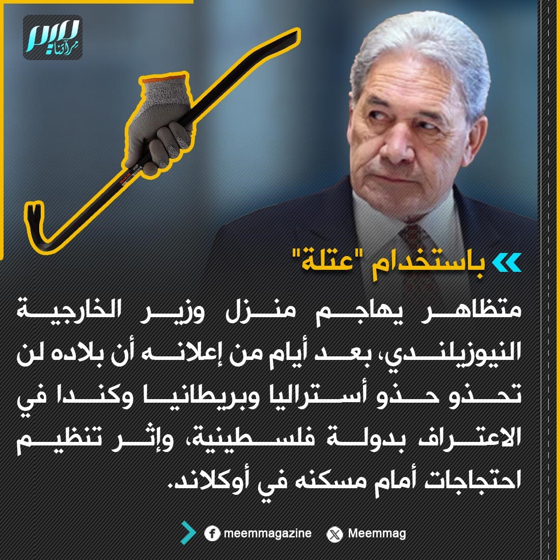 باستخدام "عتلة".. متظاهر يهاجم منزل وزير الخارجية النيوزيلندي، بعد أيام من إعلانه أن بلاده لن تحذو حذو أستراليا وبريطانيا وكندا في الاعتراف بدولة فلسطينية، وإثر تنظيم احتجاجات أمام مسكنه في أوكلاند.