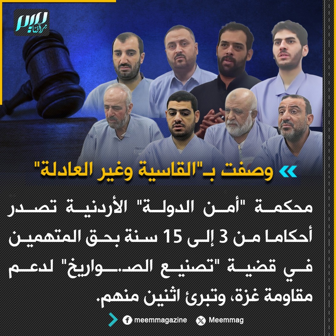 محكمة "أمن الدولة" الأردنية تصدر أحكاما من 3 إلى 15 سنة بحق المتهمين في قضية "تصنيع الصـ.ـواريخ" لدعم مقاومة غزة، وتبرئ اثنين منهم.