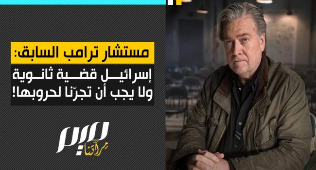 في مؤتمر لليمين الأمريكي، ستيفن بانون، مستشار ترامب السابق، وأبرز منظري حركة ماغا التي أوصلته للرئاسة : "الشرق الأوسط قضية ثانوية وإسرائيل مجرد قضية ثانوية لقضية ثانوية.. إذا قررت إسرائيل مهاجمة سوريا أو دخول لبنان فذلك شأنها، ولكنها لا يجب أن تجرّ أمريكا معها إلى حرب أخرى بلا نهاية!"