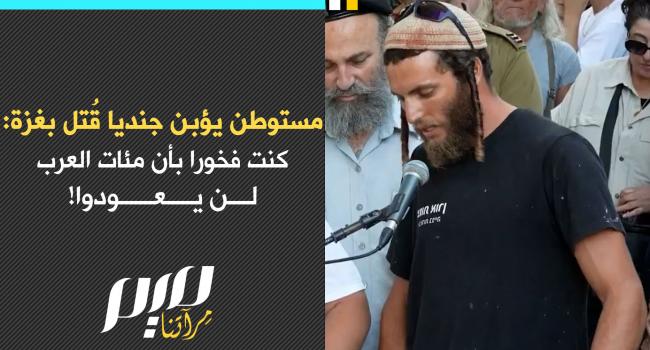 مستوطن إسرائيلي في جنازة صديقه الجندي الإسرائيلي أفراهام أزولاي:" كنت تعود دائما بعد التدمير في غزة، كنت تقول:" 200 عربي آخر لن يعودوا إلى غزة، 500 ألف، كنت فخورا بما تفعله كل يوم، لطالما حلمت بالمشروع الكبير: بناء الهيكل."