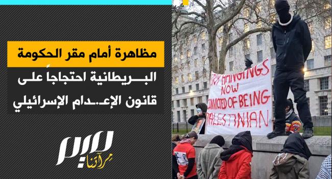 متظاهرون أمام مقر رئاسة الوزراء البريطانية "داونينج ستريت" احتجاجاً على قانون الإعدام الإسرائيلي الجديد بحق الأسرى الفلسطينيين.