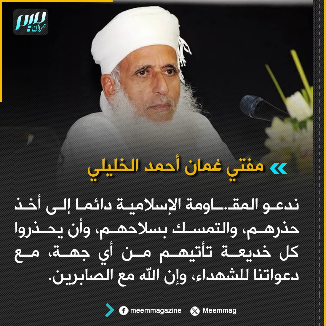 مفتي عُمان: ندعو المقـ.ـاومة الإسلامية دائما إلى أخذ حذرهم، والتمسك بسلاحهم، وأن يحذروا كل خديعة تأتيهم من أي جهة، مع دعواتنا للشهداء، وإن الله مع الصابرين.