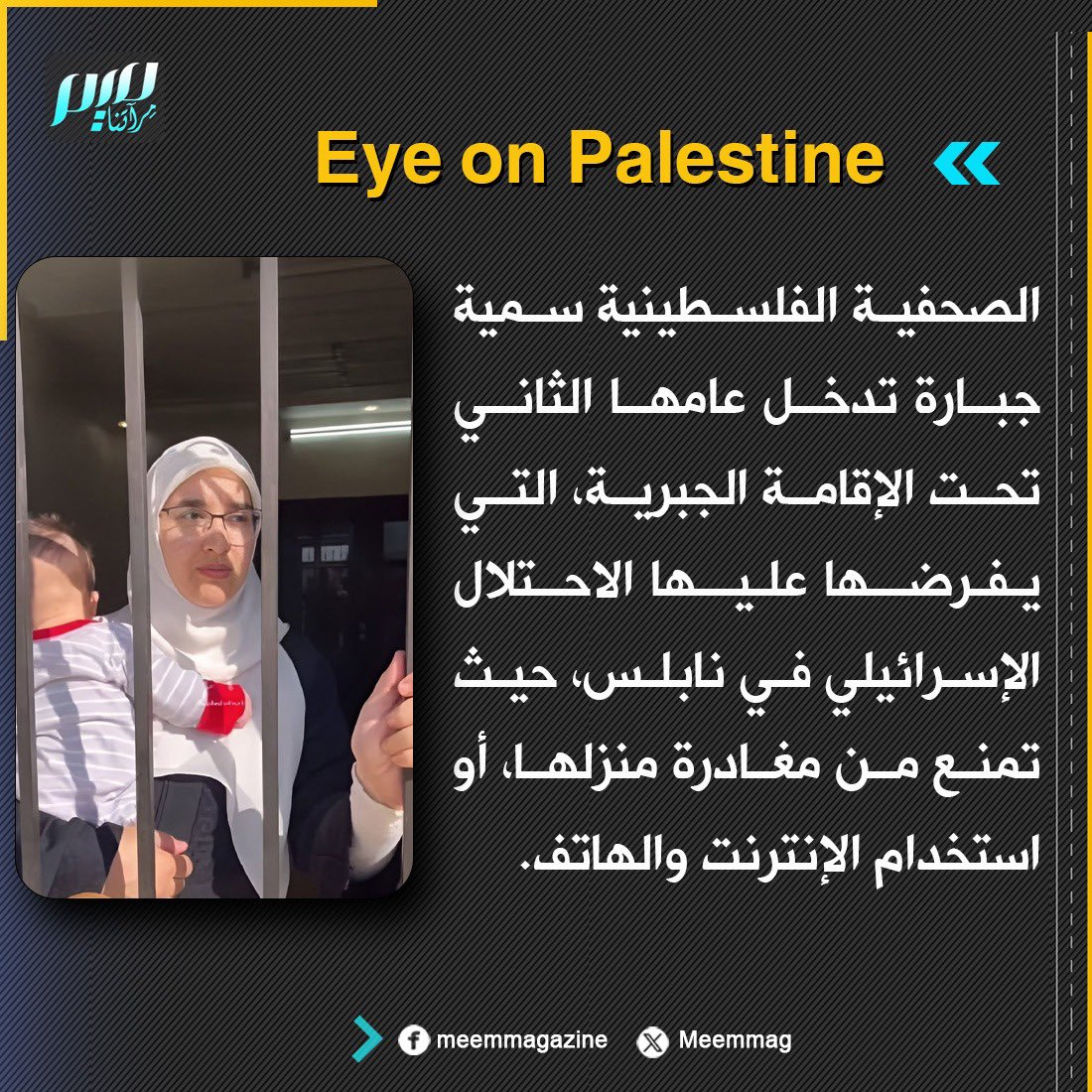 منظمة حقوقية: الصحفية الفلسطينية سمية جبارة تدخل عامها الثاني تحت الإقامة الجبرية، التي يفرضها عليها الاحتلال الإسرائيلي في نابلس، حيث تمنع من مغادرة منزلها، أو استخدام الإنترنت والهاتف.