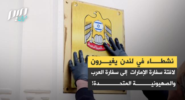 احتجاجا على تطبيع علاقاتها مع إسرائيل ودعمها الإبادة في غزة والسودان، نشطاء من حركة "الدفاع عن فلسطين" يغيرون اللافتة التعريفية لسفارة "الإمارات العربية المتحدة" في لندن إلى "سفارة العرب والصهيونية المتحدة".