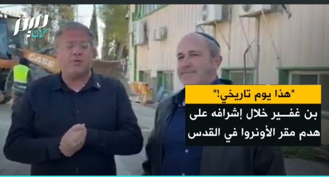 أشرف وزير الأمن القومي الإسرائيلي إيتمار بن غفير اليوم على اقتحام قوات الاحتلال لمقر وكالة الأونروا في القدس وهدمه: "هذا يوم تاريخي، هذا يومٌ بالغ الأهمية للسيادة في القدس. لسنواتٍ طويلة كان داعمو الإرهاب هؤلاء هنا واليوم يُطردون من هنا مع كل ما بنوه."