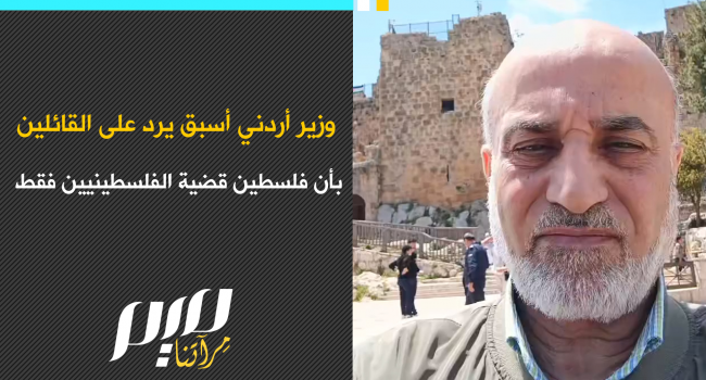الوزير الأردني الأسبق بسام العموش يرد على القائلين بأن "فلسطين قضية الفلسطينيين فقط" من جانب قلعة صلاح الدين الأيوبي في محافظة الكرك، شمال المملكة، داعيا الله بقائد مسلم مثله للأمة يحرر المقدسات.