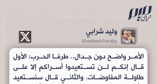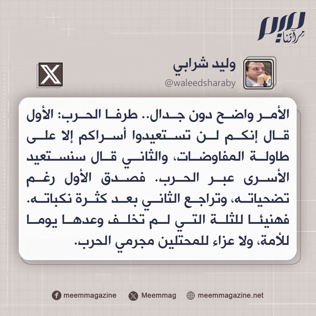 وليد شرابي: الأمر واضح دون جدال.. طرفا الحرب: الأول قال إنكم لن تستعيدوا أسراكم إلا على طاولة المفاوضات، والثاني قال سنستعيد الأسرى عبر الحرب. فصدق الأول رغم تضحياته، وتراجع الثاني بعد كثرة نكباته.