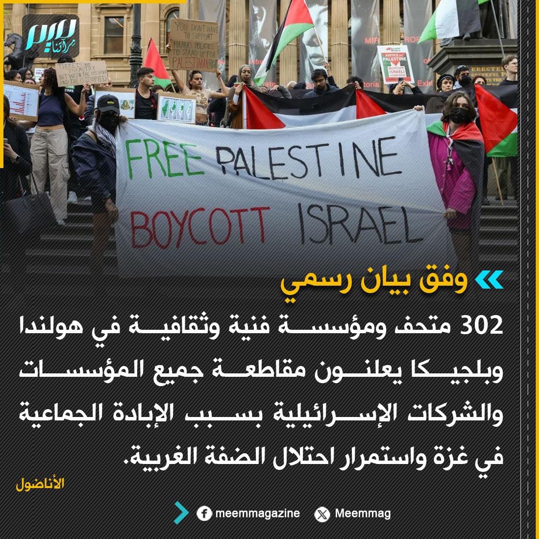 ‏302 متحف ومؤسسة فنية وثقافية في هولندا وبلجيكا يعلنون مقاطعة جميع المؤسسات والشركات الإسرائيلية