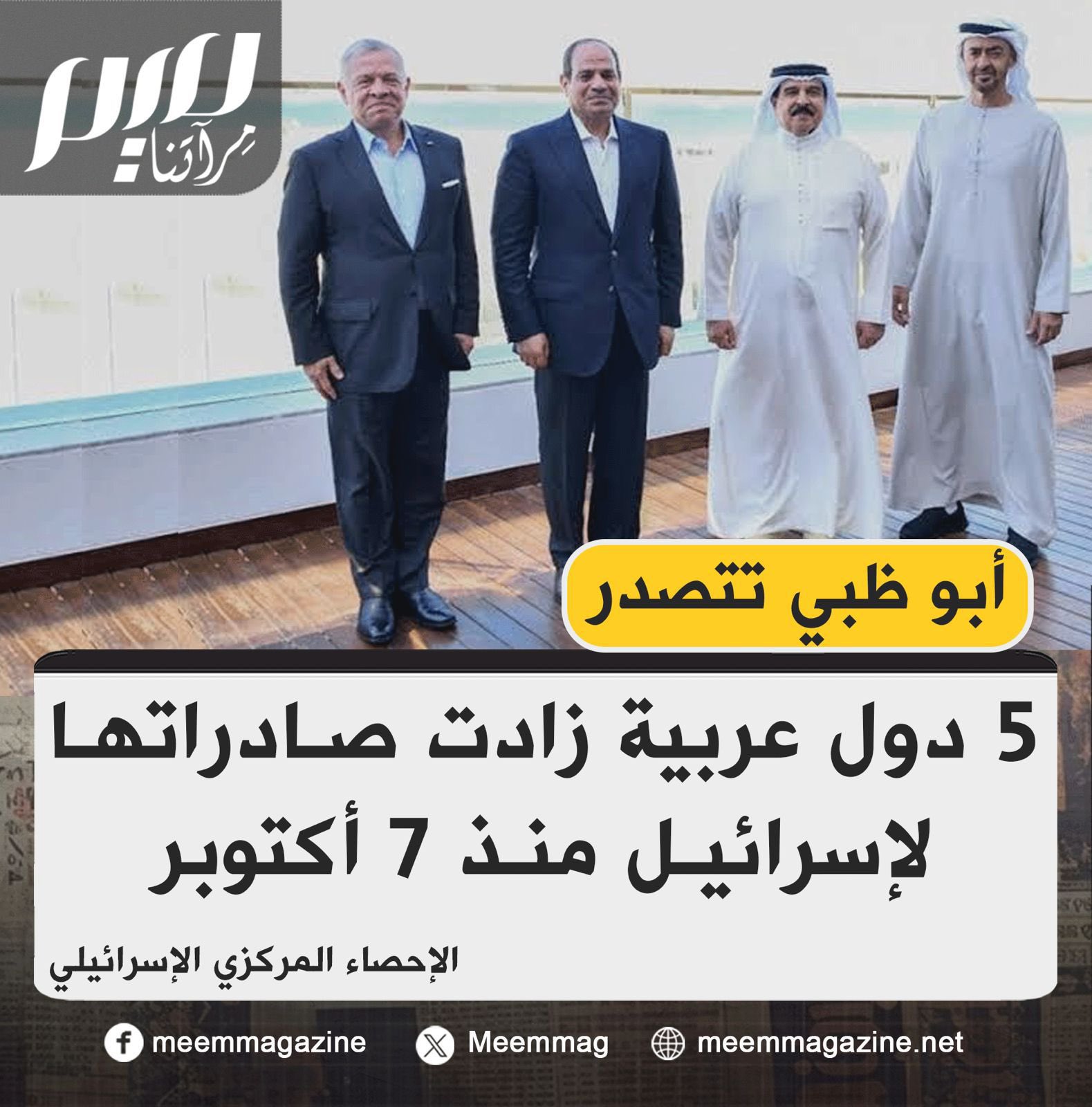 أبو ظبي استحوذت على 81.4%.. مكتب الإحصاء المركزي الإسرائيلي يكشف زيادة الإمارات ومصر و الأردن والمغرب والبحرين صادراتها إلى تل أبيب، منذ بدء حربها على غزة، حتى بلغت أكثر من 2 مليار دولار نهاية مايو الماضي.