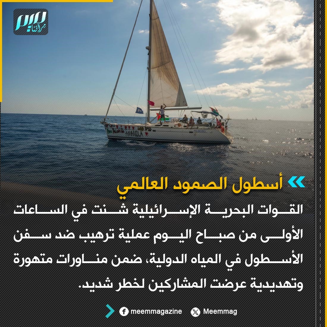 أسطول الصمود العالمي: القوات البحرية الإسرائيلية شنت في الساعات الأولى من صباح اليوم عملية ترهيب ضد سفن الأسطول في المياه الدولية، ضمن مناورات متهورة وتهديدية عرضت المشاركين لخطر شديد.