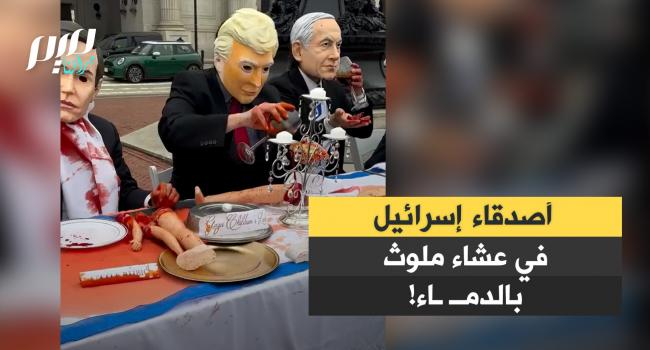 على مائدة عشاء ملطخة بدمـ ـاء الأبرياء.. ناشطون يجسدون نتنياهو وأصدقاؤه وهم يلتهمون أجساد أطفال غزة!