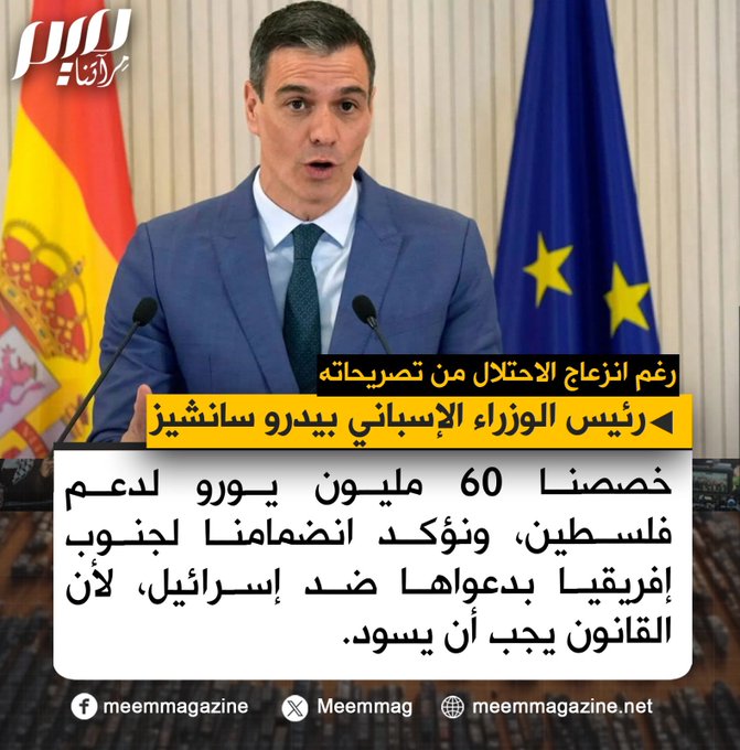 إسبانيا تخصص 60 مليون يورو لدعم فلسطين، مع تأكيدها الانضمام لـجنوب إفريقيا بدعواها ضد إسرائيل، كما جاء على لسان رئيس الوزراء الإسباني بيدرو سانشيز.